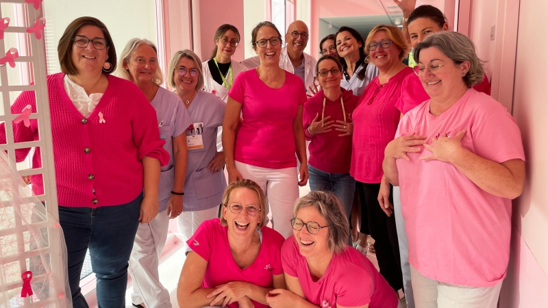 Les professionnels du pôle Femme - Mère - Enfant vêtus de rose pour symboliser leur soutien et l'engagement du Pôle Santé Sarthe et Loir dans la lutte contre le cancer du sein